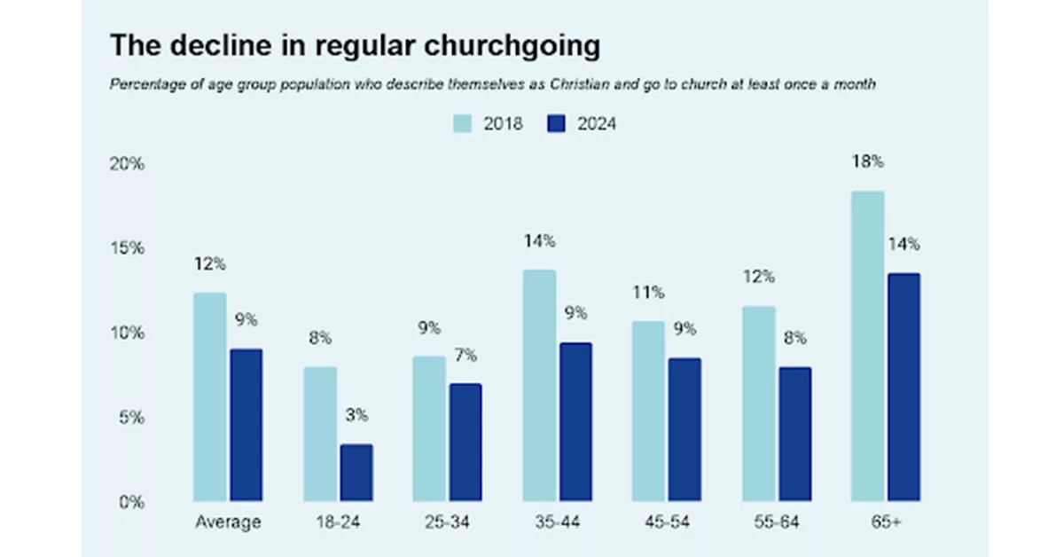 The decline in regular churchgoing includes Gen Z, who are also the lowest attenders of all generations.